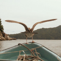 The image shows a bird, specifically a seagull, flying above the water. In the foreground, there is