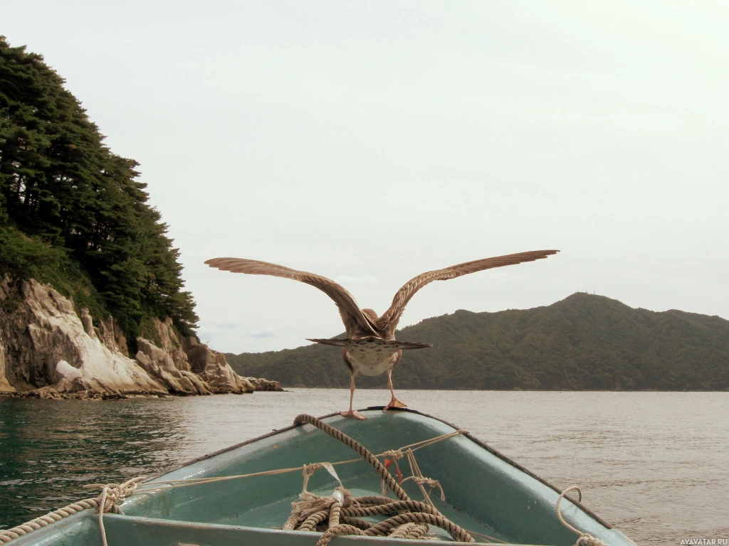 a small boat with its motor visible, suggesting that it might be used for fishing or recreation. In the background, there are mountains and trees, indicating that this scene takes place near a coastline with