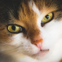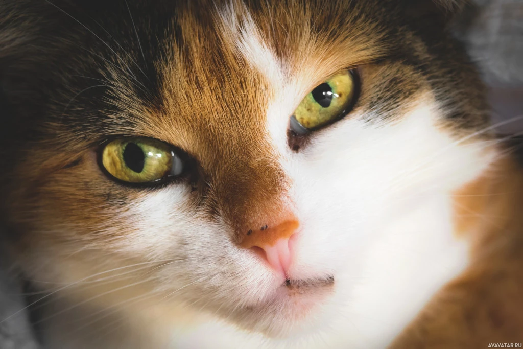a calico cat, characterized by its distinctive coat pattern with patches of black, orange, and white fur. The cat has