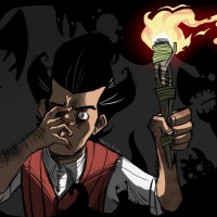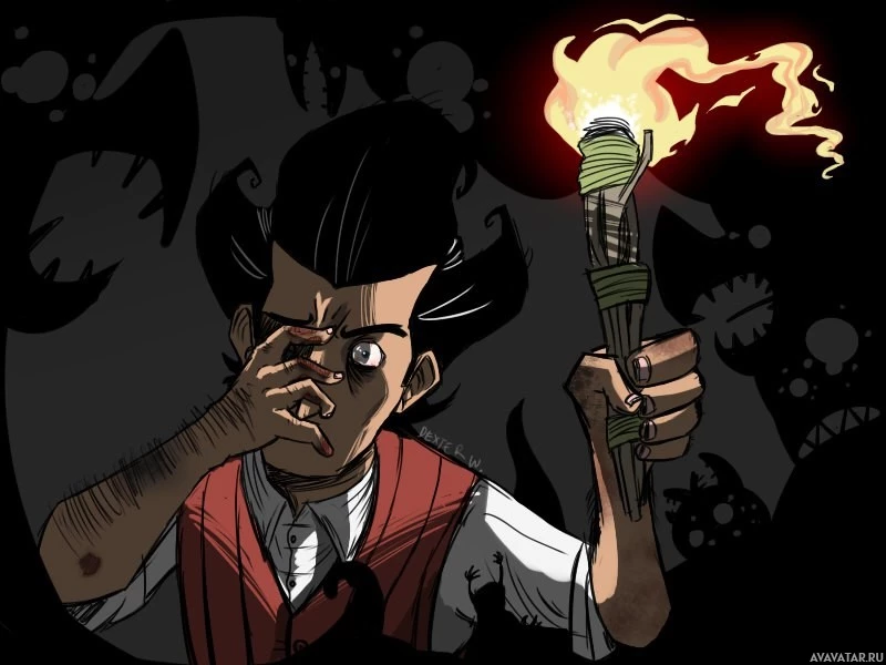 a chaotic environment, which might be indicative of the game "Don't Starve." The character's expression and posture convey a sense of emotional turmoil or high-stakes drama that is often associated with