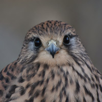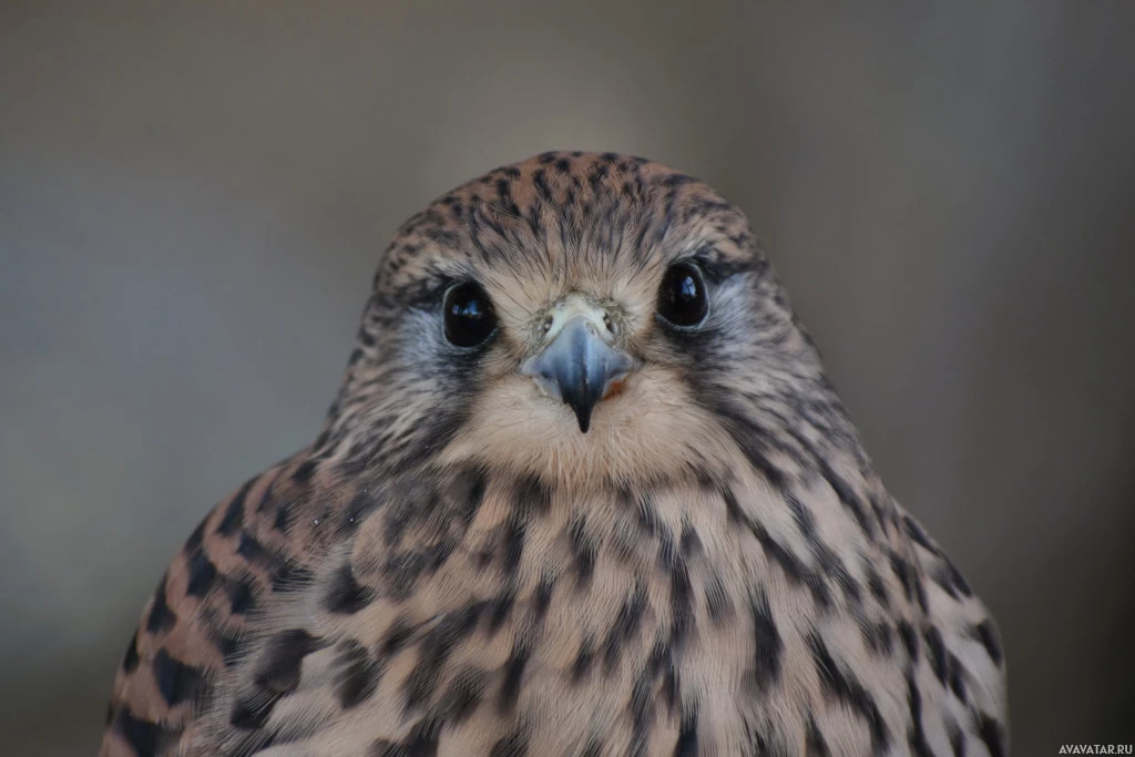 На картинке изображена птица, в частности сокол. Похоже, что он находится в фокусе с головой сокола и верхней частью тела, хорошо видимой. Сокол имеет заостренный клюв и острые глаза, которые смотрят прямо в камеру.