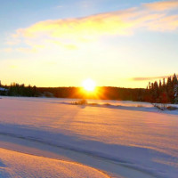 the soft glow of the early morning sky, illuminating the scene with hues of orange and yellow that contrast beautifully against the white snow. This setting conveys a serene sense of peacefulness and