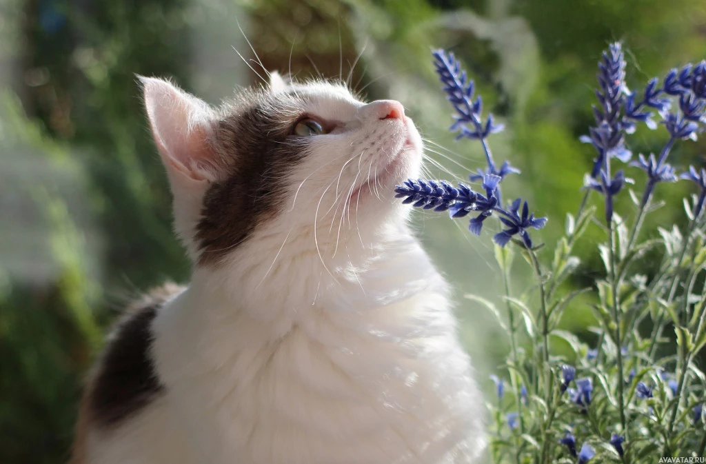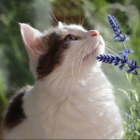 blue flowers in the foreground; these could potentially be lavender or similar species. The setting seems to be an outdoor garden or a similarly