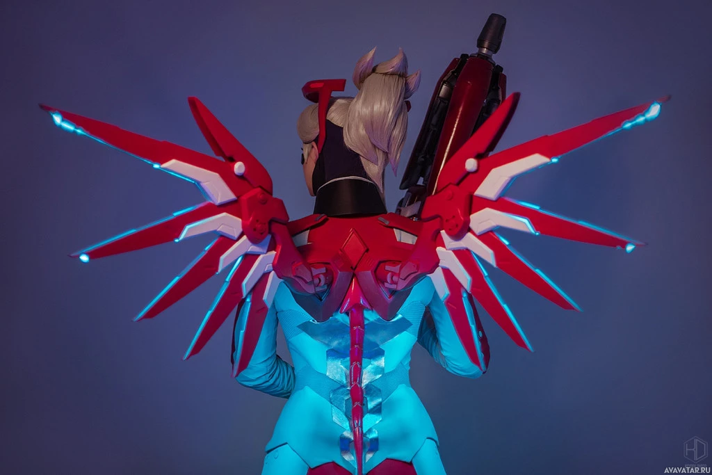 The image features a person dressed as Mercy from
