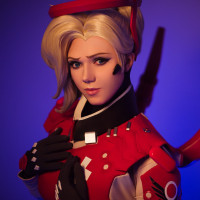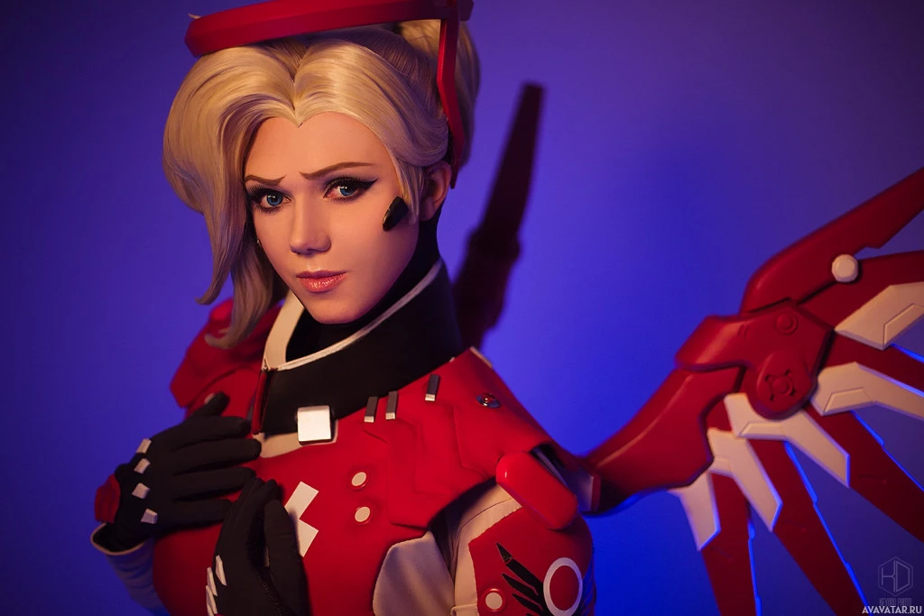 The image shows a person cosplaying as Mercy from