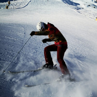 a snowy slope. They are wearing skis and appear to be in motion, possibly turning or maneuvering down the hill. In the background, there is