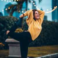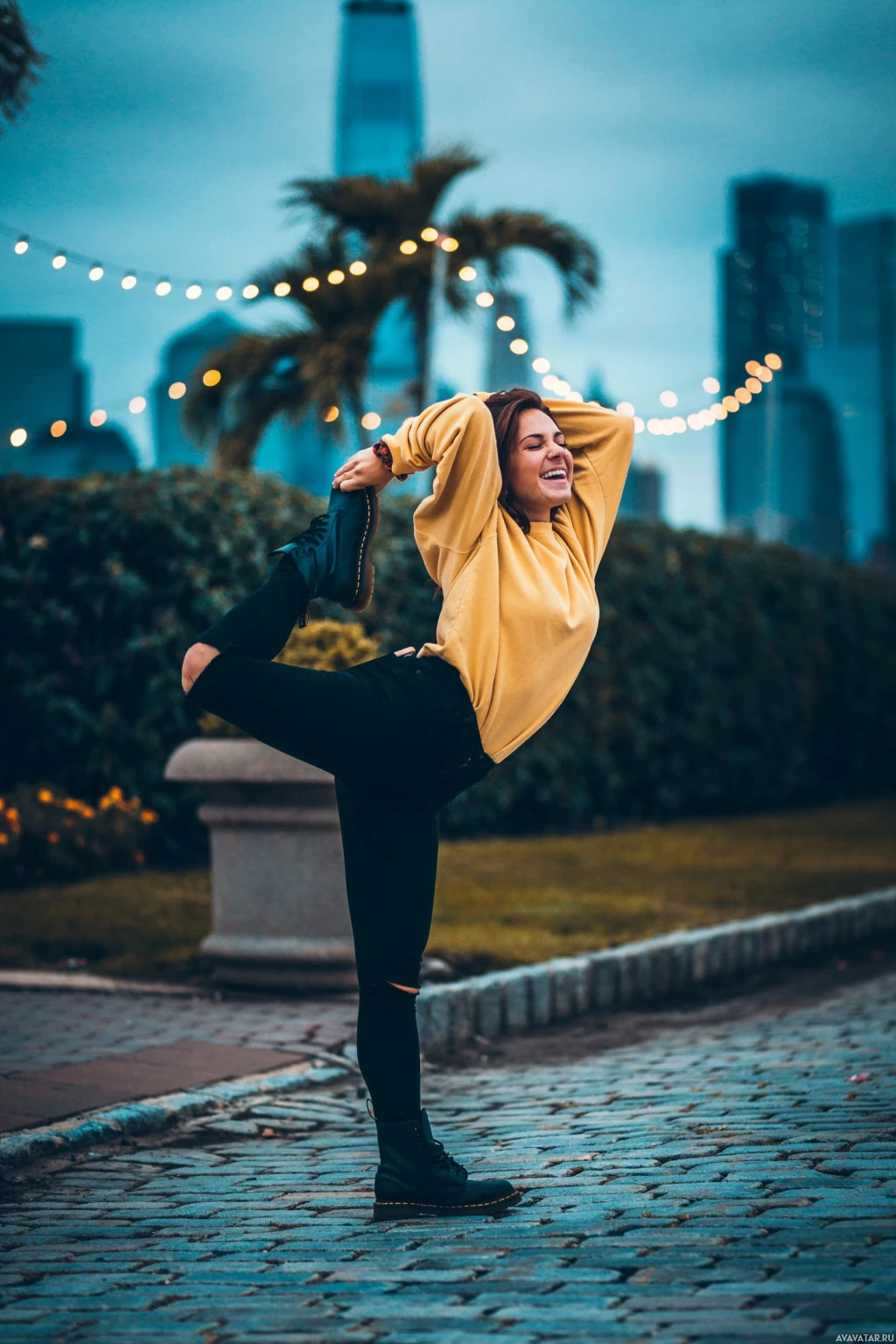 an urban setting given the background that features buildings and streetlights. She is wearing a yellow top and