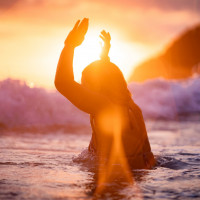 The image shows a silhouette of a girl in the ocean at sunset. She appears to be enjoying the water and is looking towards the setting sun, with one hand raised as if waving or signaling. The warm colors from the sunset create a serene atmosphere over the body of water.