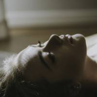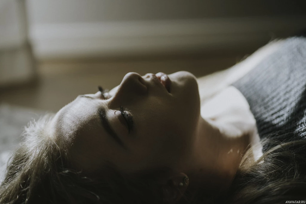The image shows a woman lying down with her eyes closed. She appears to be in