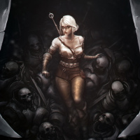 The image depicts a stylized illustration with a central figure, which appears to be the character Ciri from "The Witcher" series. She is shown holding a bow and arrow, standing amidst what seems to be a battle or