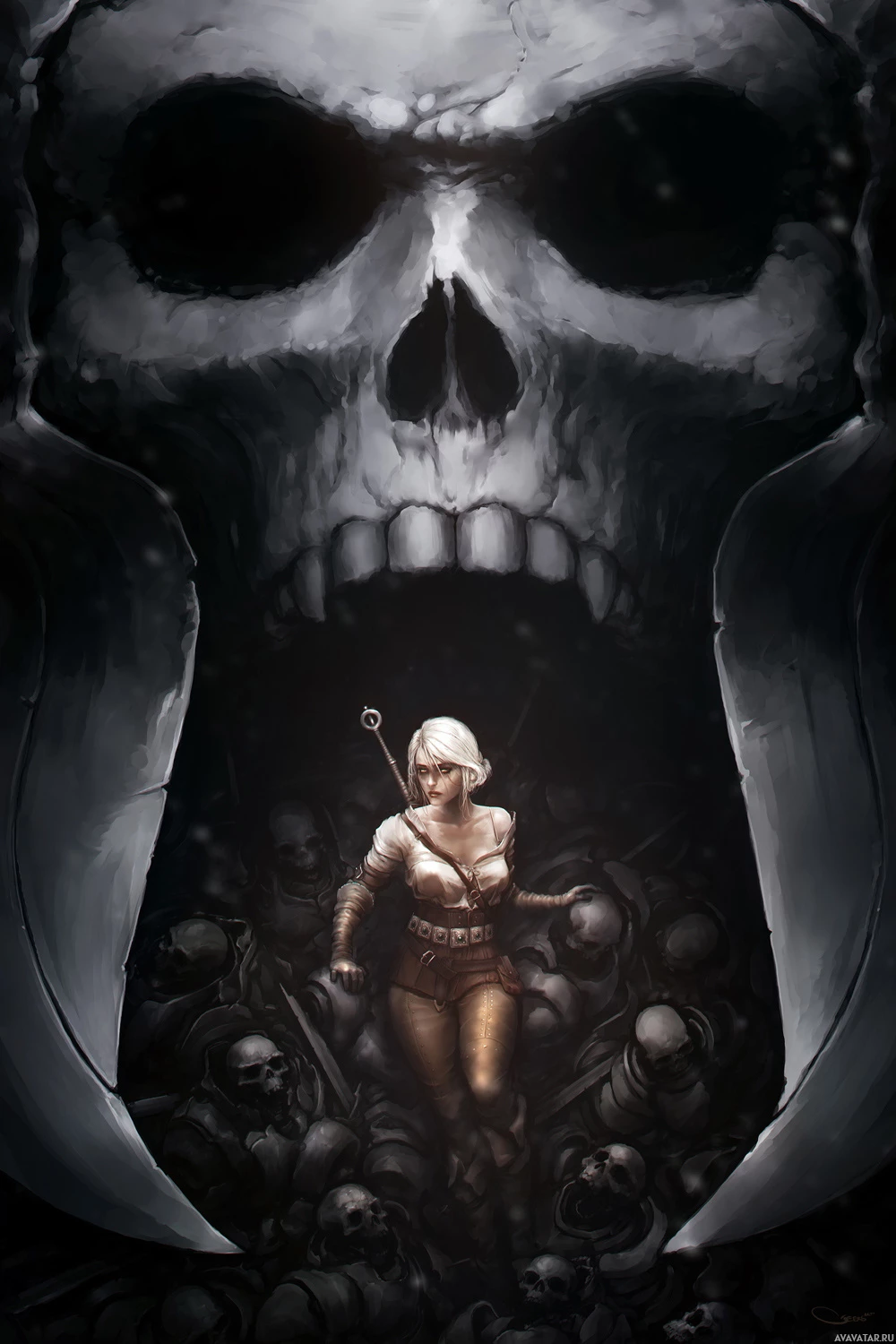 confrontation scene, as evidenced by the multiple skulls surrounding her. The image also features a prominent skull that dominates the background, adding