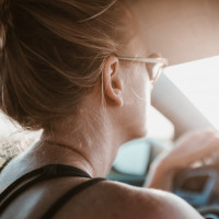 wearing sunglasses and a top. She appears to be focused on the road ahead. The image does not provide enough detail to confidently identify any