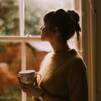 На снимке женщина стоит возле открытого окна. Она держит чашку кофе или чая и смотрит в окно с улыбкой на лице. Ее волосы оттянуты назад в прическу, и она, кажется, наслаждается своим напитком в уютной обстановке в помещении с естественным светом, проходящим через окно.