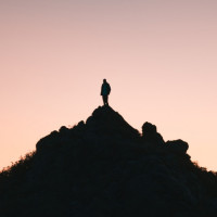 a silhouette of a person standing atop a mountain peak during either sunrise or sunset, given the warm hues in the sky. The