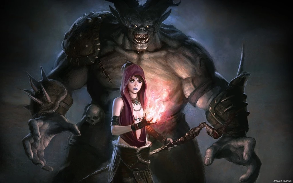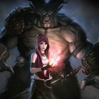 purple hair and typically wears dark clothing adorned with feathers or bones. The setting appears to be a fantasy-themed environment, possibly in a dungeon or an underground area, given the dim lighting and ominous atmosphere.