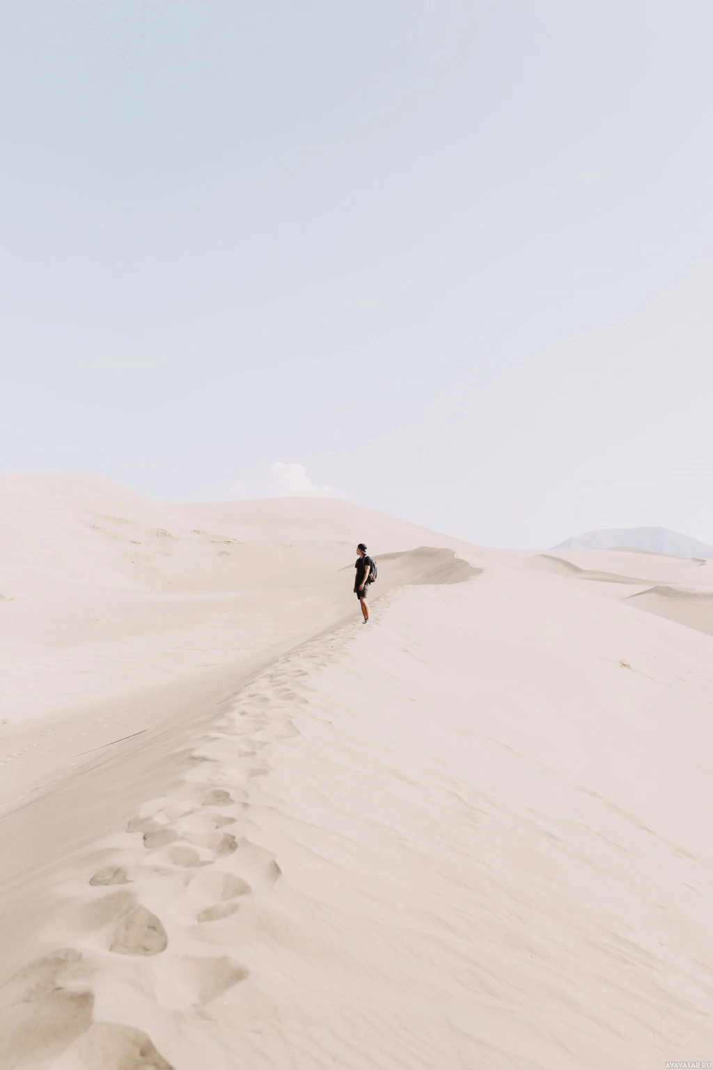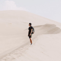 casual attire and carrying a backpack, suggesting they might be on an adventure or excursion. The background features sand dunes typical of desert environments, and the sky is clear with some clouds, indicating fair