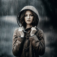 a girl with an umbrella. The rain is falling around her, and she's wearing what seems to be
