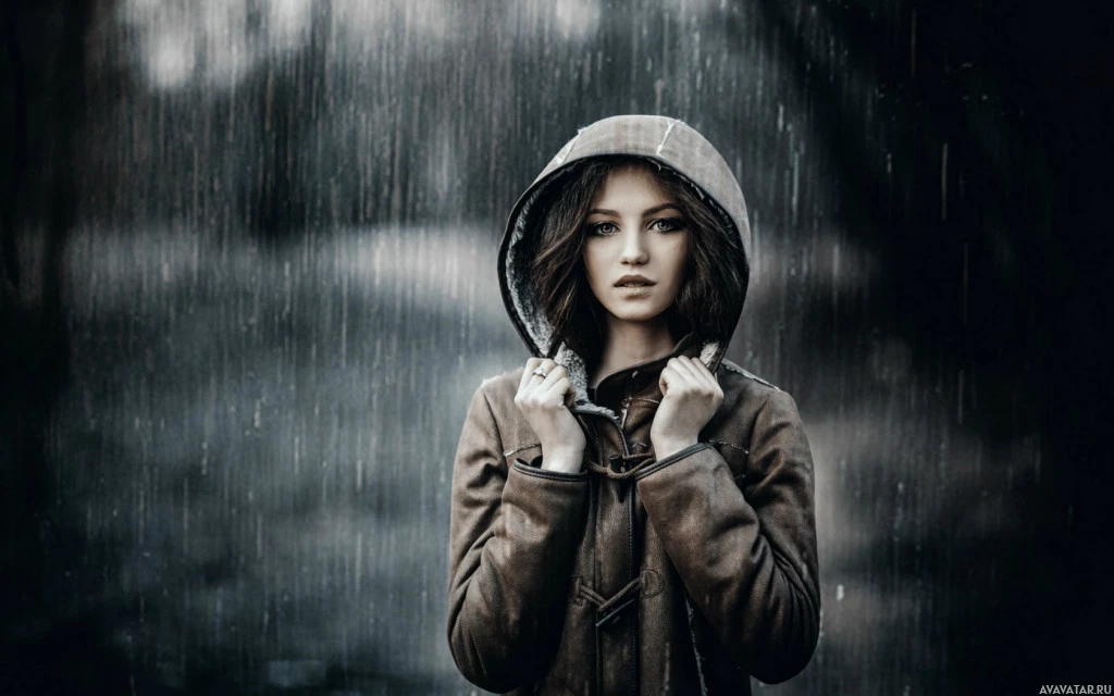 a hooded raincoat or jacket. She appears to be looking directly at the viewer, possibly indicating that the photographer took the photo from where the viewer would be sitting.
