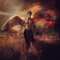 The image depicts a fantasy scene with a male character who appears to be an angel. He has wings and is shown in a dramatic pose, possibly during or after battle. The background suggests a post-apocalyptic setting with destruction, indicating a theme of chaos and struggle.