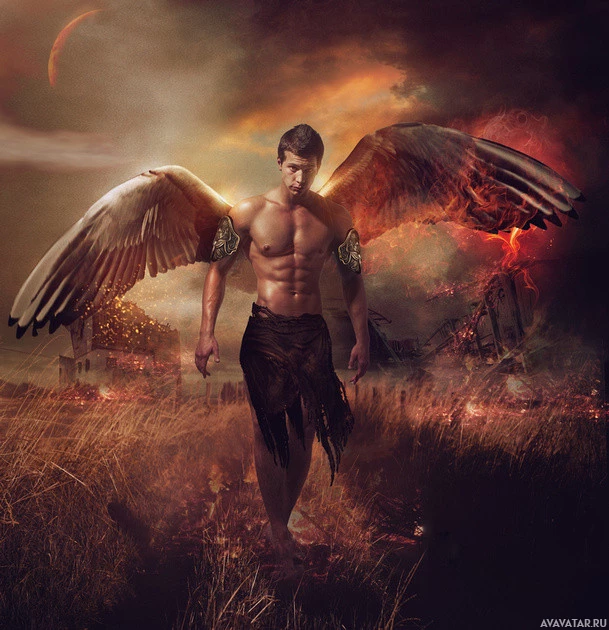 На картинке изображена сцена фэнтези с мужским персонажем, который кажется ангелом. Он имеет крылья и показан в драматической позе, возможно, во время или после боя. Фон предполагает постапокалиптическую обстановку с разрушением, указывая на тему хаоса и борьбы.