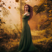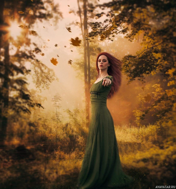 a forest setting, with trees and what appear to be autumn leaves on the ground around her. There are also some mist or fog elements that give the scene an ethereal quality. Her pose and attire suggest a character from a story or fantasy.