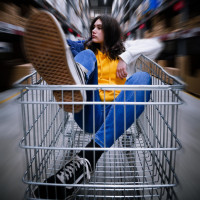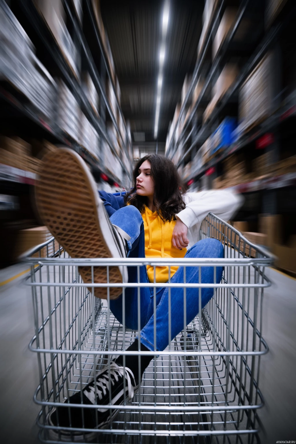 brunette hair, and she is resting her foot on the edge of the shopping cart. She seems to be indoors, likely inside a warehouse or store setting due to the presence of