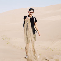 The image shows a person standing on what appears to be a sandy or desert-like environment. The individual is dressed in casual attire suitable for outdoor activities and seems to be holding or stirring up some sand, possibly in a playful or artistic manner. This could be a scene from an adventurous travel or exploration trip in a desert setting.