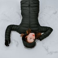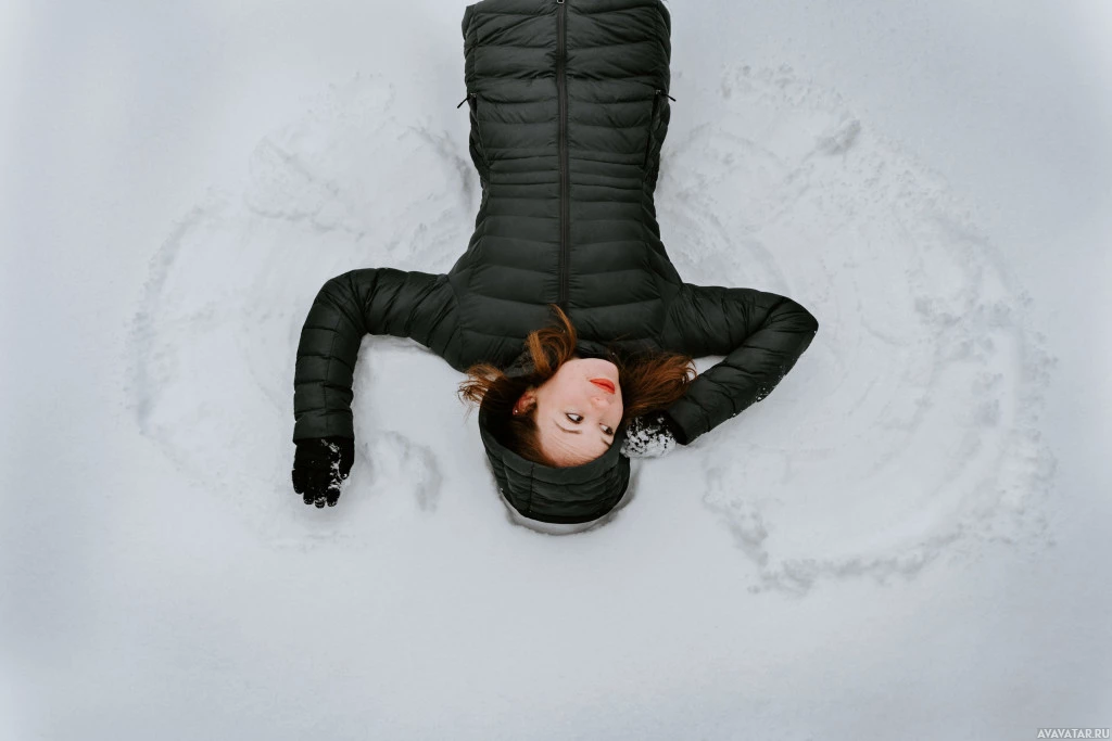 back in the snow, with their arms outstretched, creating a star-like shape. They are wearing