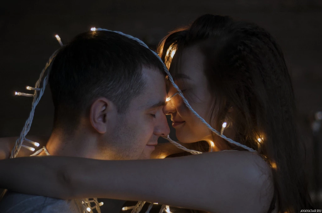 twinkling lights, suggesting they might be celebrating or at a festive event. The other person's face is obscured by the lighting and their hair. They appear to be sharing