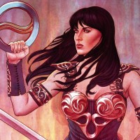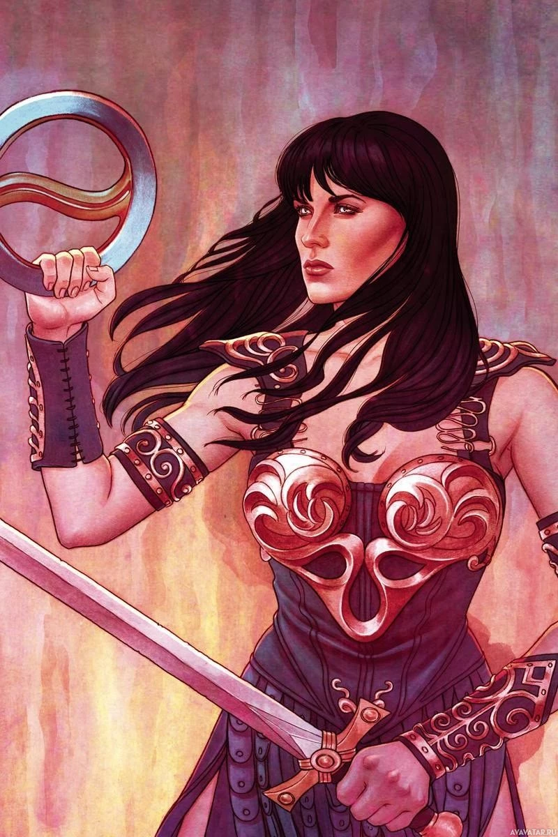 a female character dressed in ancient armor and wielding a sword, suggesting she is portraying the role of a warrior or warrior princess. She has