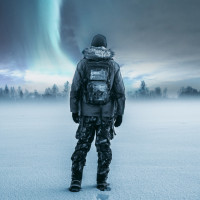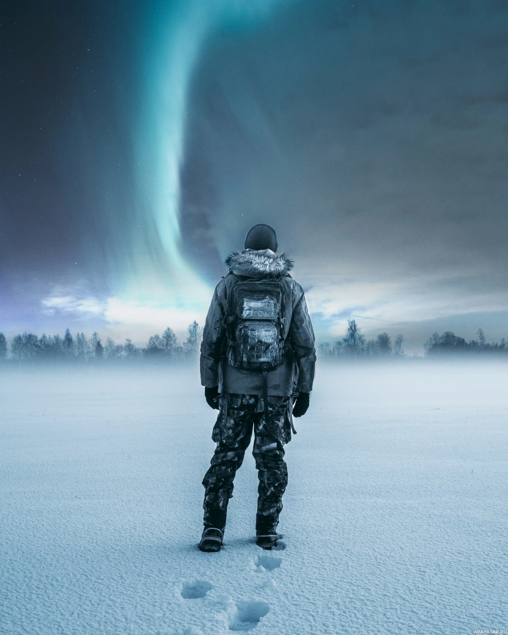 the aurora borealis in the background. The person is wearing