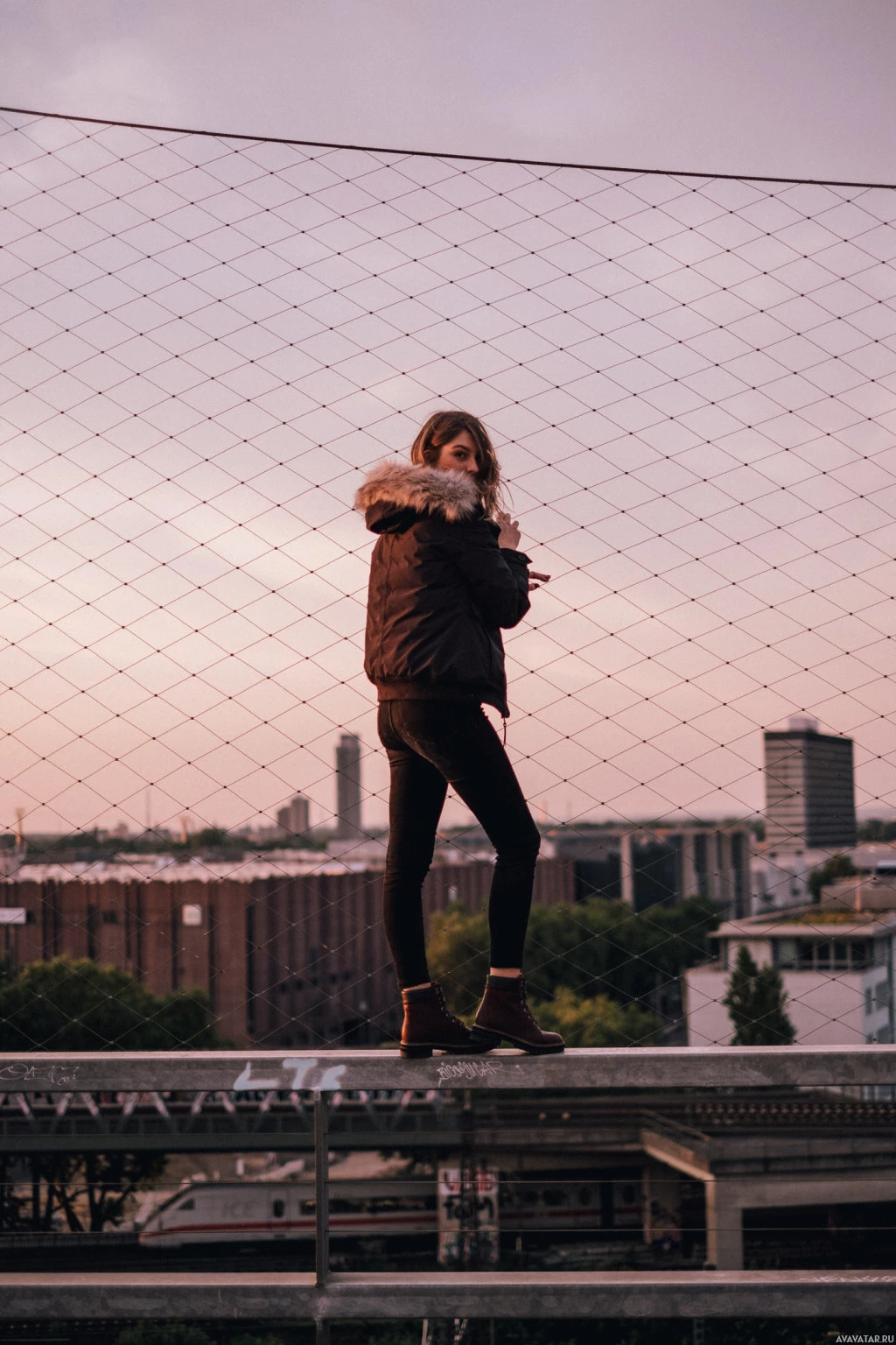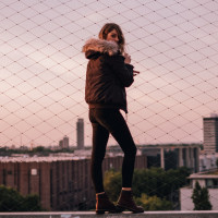 casual attire suitable for cold weather, including a jacket with a fur-lined hood and boots. They are facing away from the camera, looking out over the urban landscape, which includes buildings and