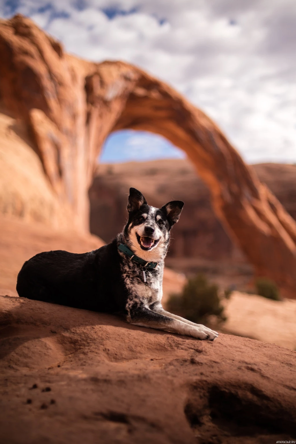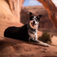 In the picture, there is a dog sitting on some rocks. The background features an iconic red