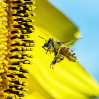 The image shows a bee (a type of insect) on the side of a sunflower. The flower is yellow with distinctive rays and a central disc, which is characteristic of sunflowers. There are also some