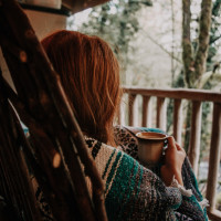 a woodland setting, possibly a cabin or a cottage in the countryside or forest. The person is relaxing and enjoying their drink while taking in