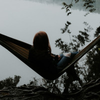 The picture shows a person sitting in a hammock, with their back to the viewer. They are located outdoors, near water (possibly a lake) surrounded by trees and foliage. The focus is on the individual's relaxed posture as they enjoy