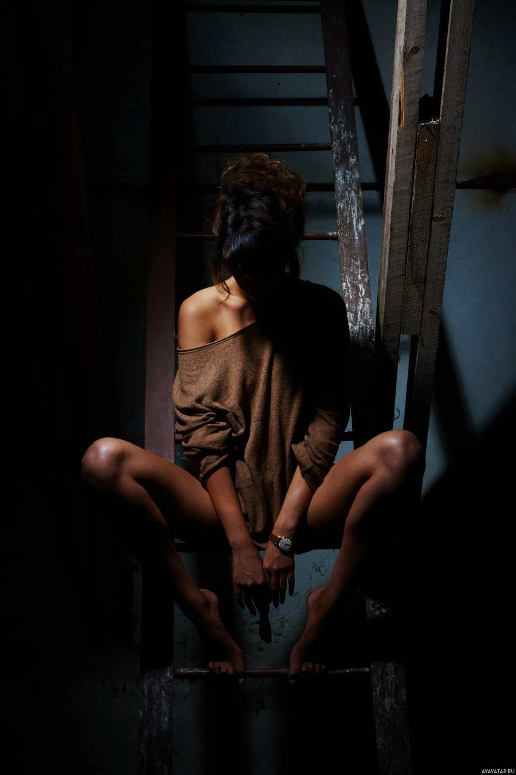 The image features a person sitting on some steps. They appear to be in a dimly lit, possibly outdoor setting with a rusted metal staircase and a wall that might suggest an industrial or urban environment. The individual is wearing a brown top and seems to be in a contemplative pose.
