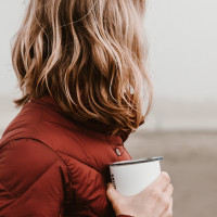 На картинке изображена женщина, которая выглядит блондинкой и у нее длинные волосы. Она носит красную куртку и держит в руке чашку. Обстановка, кажется, находится на открытом воздухе с пасмурным небом, как предполагают цвета и освещение на изображении.