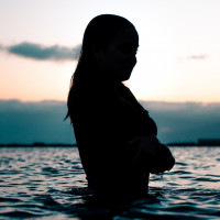 The image shows a silhouette of a person standing waist-deep in water during what appears to be either sunrise or sunset. There's a gradient sky with warm hues, suggesting the photo might have been taken at dawn or dusk. The scene conveys a sense of tranquility and introspection.