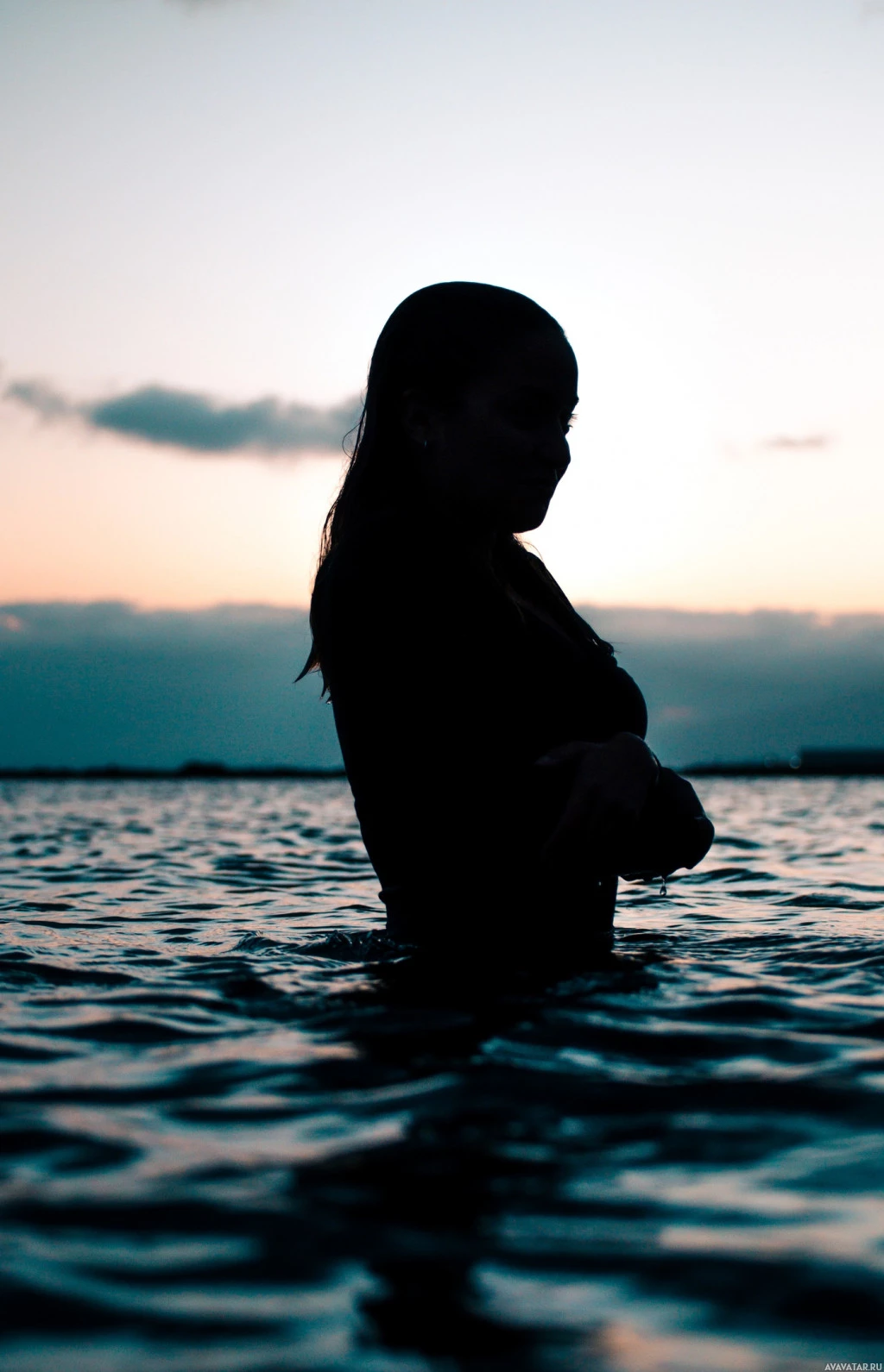 На картинке изображен силуэт человека, стоящего по талии в воде во время восхода или заката солнца. Существует градиентное небо с теплыми оттенками, предполагая, что фотография могла быть сделана на рассвете или в сумерках. Сцена передает чувство спокойствия и самоанализа.