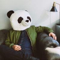The image features a person wearing a panda mask. They are seated comfortably on a couch in an indoor setting, possibly a living room or a relaxation area. The individual appears to be casually dressed, with the mask covering their face and head.