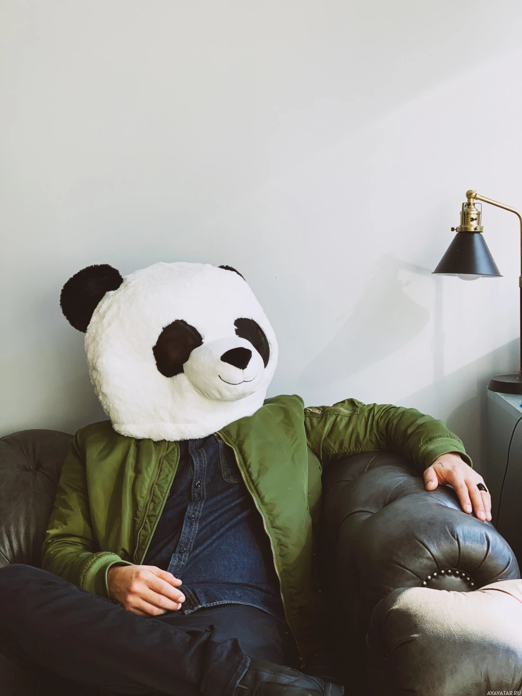 На картинке изображен человек в маске панды. Они удобно сидят на диване в помещении, возможно, в гостиной или зоне отдыха. Человек, кажется, небрежно одет, с маской, закрывающей лицо и голову.
