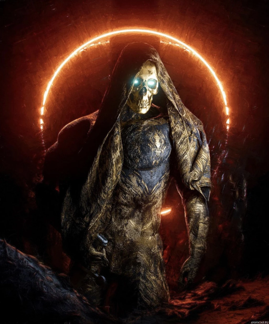 the Grim Reaper or Death, portrayed in a menacing and powerful manner. This figure is wearing a dark