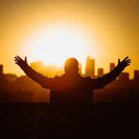 a silhouette of a person with their arms raised towards the sky, possibly in a gesture of celebration or worship. The background is set against an orange and yellow sunset, which creates