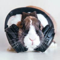a cute bunny wearing a pair of headphones. The headphones are resting on the rabbit's ears, and it appears to be sitting or laying down in front of