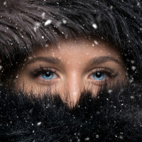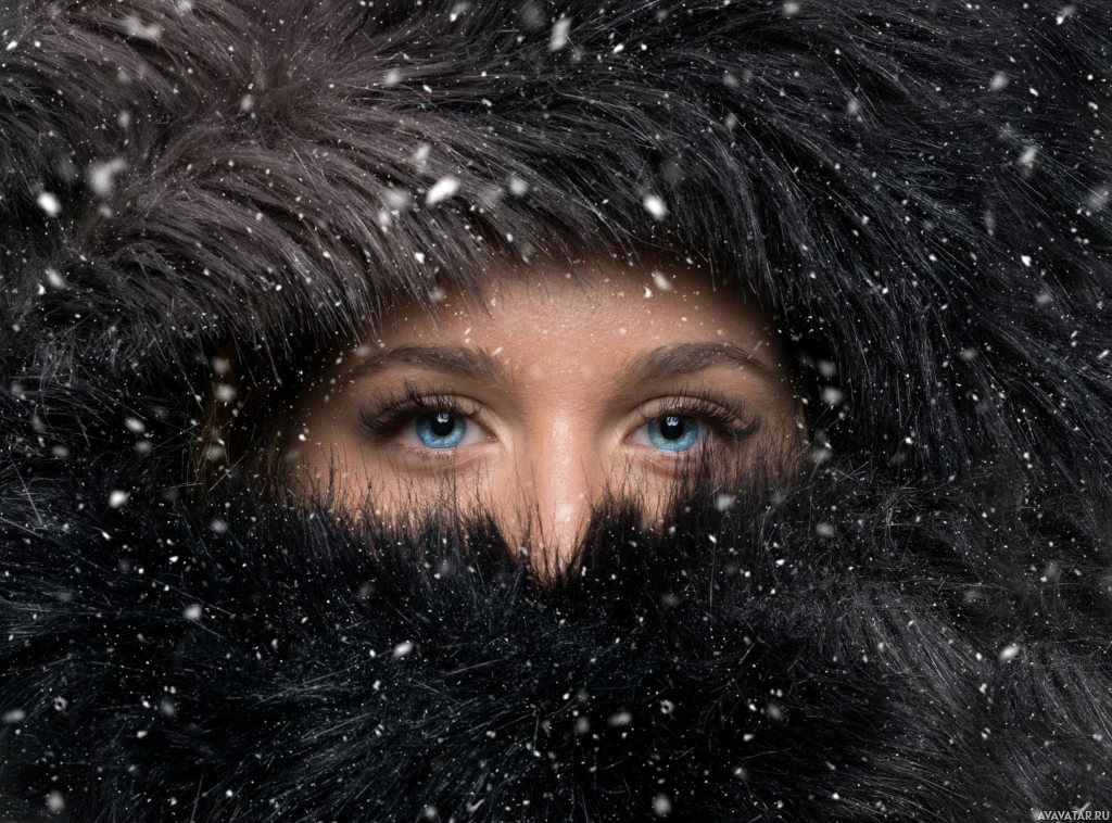 a fur coat and a hood that covers her head. She has