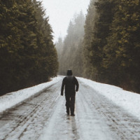 a solitary figure walking down a snow-covered road, seemingly from behind. The person is bundled up against the cold and is wearing