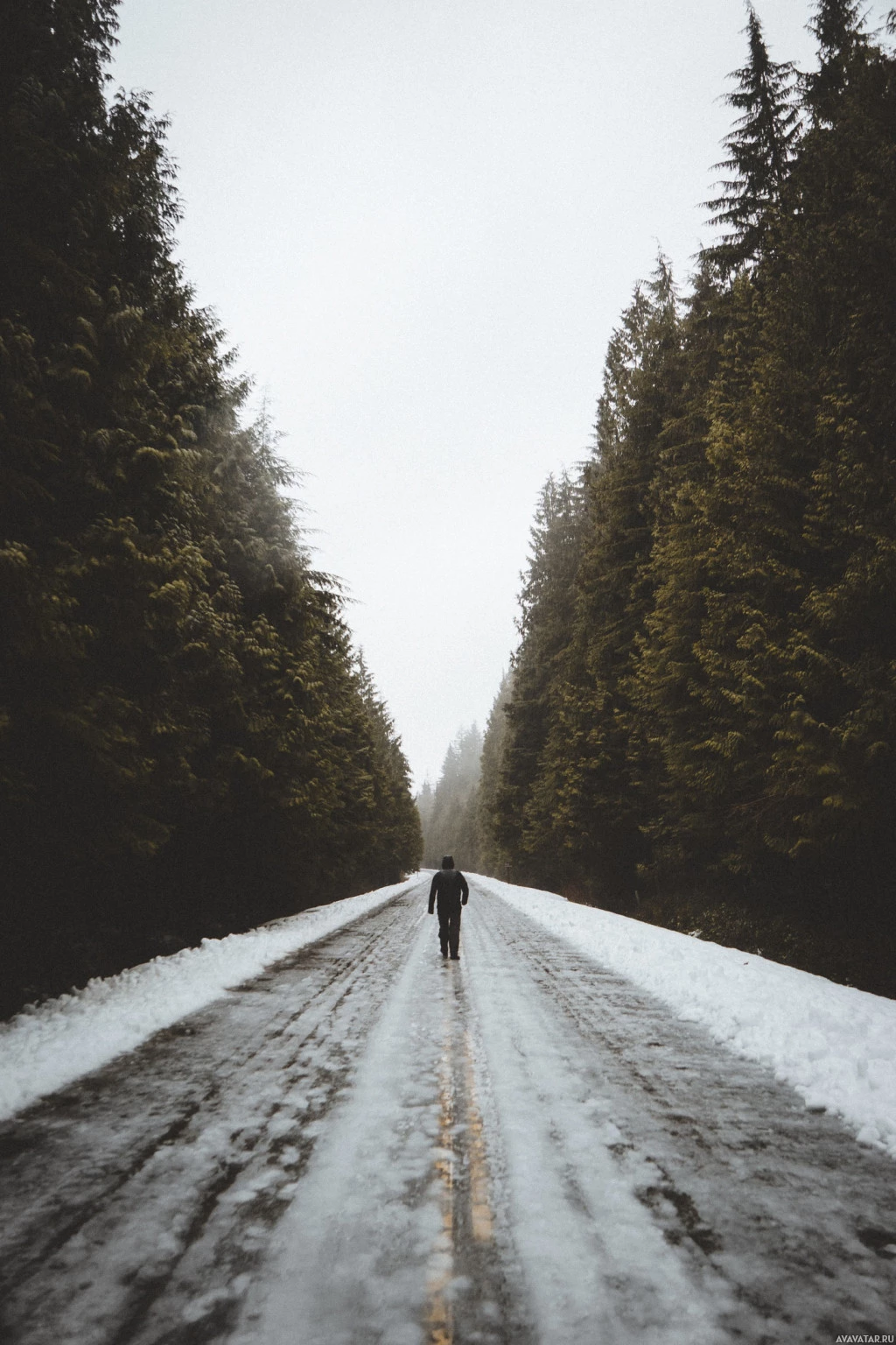 a hooded garment that partially obscures their head and back, suggesting that they are perhaps trying to stay warm in the chilly environment. The road itself appears to be icy or snow-covered, indicating recent winter