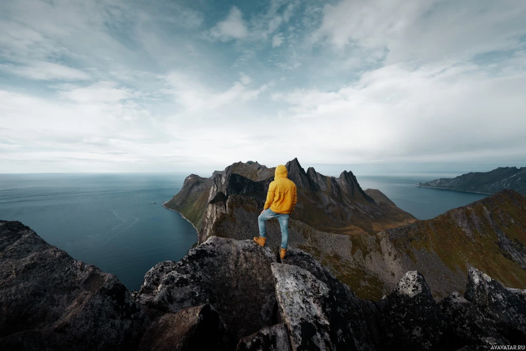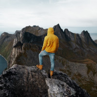 rocky outcrop with a view of a fjord or lake surrounded by mountainous terrain. The individual is wearing a yellow hoodie and jeans, which suggests they might be dressed for a casual hike or exploration rather than extreme