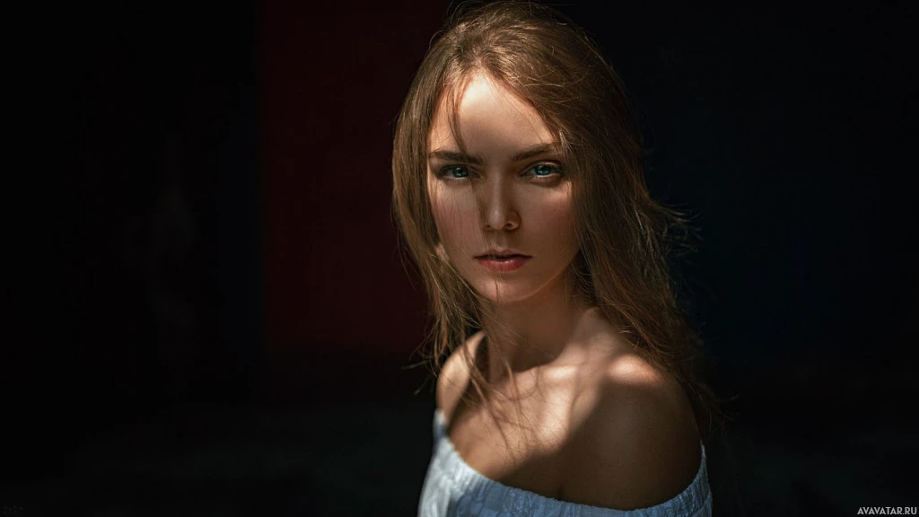 blonde hair and is wearing a light, off-the-shoulder top that appears to be white or light blue in color. Her expression is neutral, and she seems to be standing indoors as there's a shadow visible on her left side which might indicate